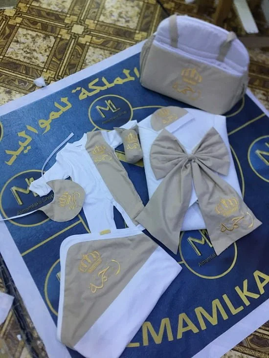 طقم مولوده بناتي بالاسم تجسد الأناقة والراحة في آن واحد بتفاصيل متقنة، وأقمشة فاخرة، وألوان بناتية متناغمة