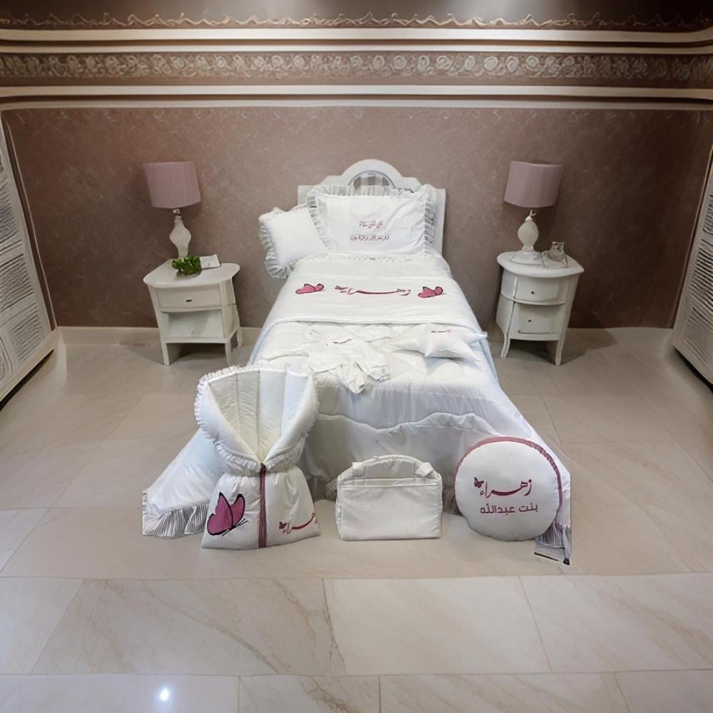 أضفي لمسة خاصة على مناسبتكِ مع مفارش استقبال طقم بالاسم بتصميم فريد وتطريز اسم المولود طقم فاخر بتصميم ناعم وألوان هادئة، يوفر راحة فائقة للأمهات الجدد مصمم بأناقة وجودة عالية لتكوني مستعدة بأفضل طريقة لحظة ولادتك